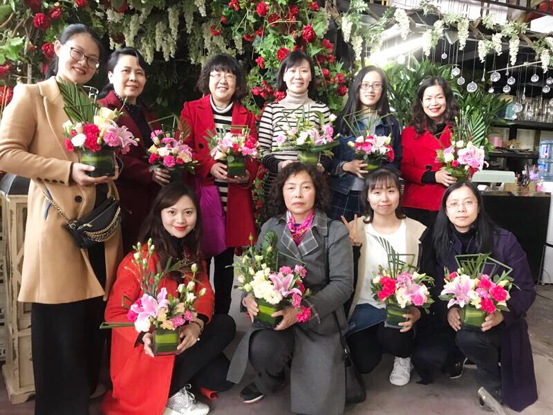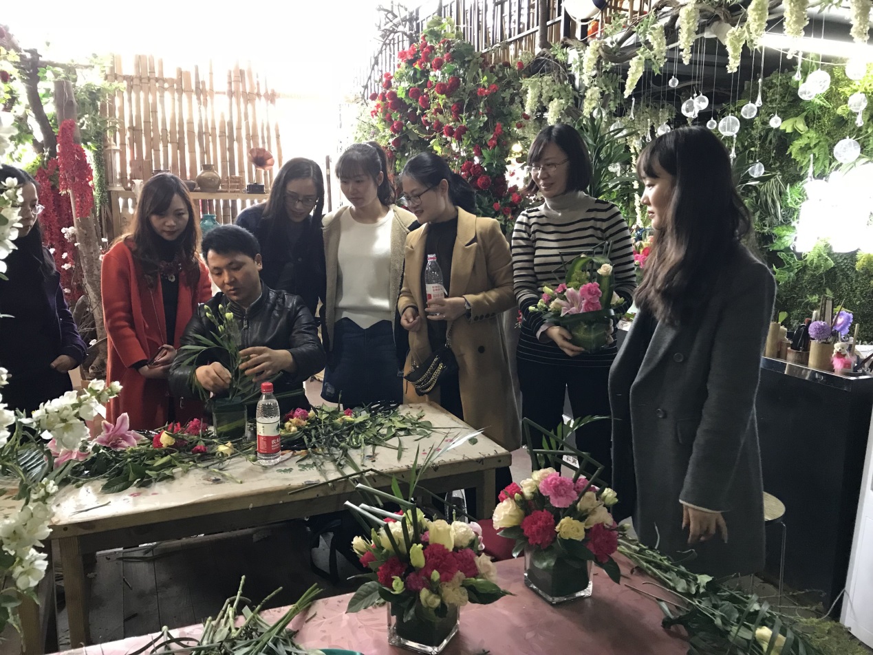 插花培训活动在三圣乡成都尚艺花品馆举办。首先,花艺培训老师为大家介绍了花艺基本知识,包括插花的时间性、生命期、时尚性、装饰性等特点,以及插花所使用的材料及工具的使用方法等,并为大家示范制作了一个插花作品。随后,大家开始了插花实践,芬芳的百合、浪漫粉色的玫瑰、高雅神秘的桔梗、红色粉色的康乃馨,以及各色花卉放满了一桌。在老师的指导下,大家的作品讲究色彩搭配,错落有致。而艺术感满分的同事也开始了与众不同的艺术插花,同样美丽别致。?
