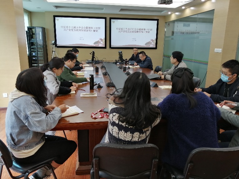 中心纪委书记江晓波为支部党员做《解读中纪委十九届五次全会精神和党员权利保障条例》的报告。江晓波深入讲解了习近平总书记在第十九届中央纪律检查委员会第五次全体会议上发表的重要讲话精神,强调全面从严治党首先要从政治上看,不断提高政治判断力、政治领悟力、政治执行力;江晓波还从“为什么”、“是什么”和“怎么办”深入浅出讲解了《中国共产党党员权利保障条例》内涵,强调在实践中党员切记行使权利必须以履行义务、担当责任、遵守纪律为前提,以正当的组织程序为前提。结合工作实际,江晓波还介绍了科研经费使用中的“红线”和“禁区”问题及部分科研诚信案例,督促全体党员牢固树立底线思维,谨守制度红线,诚信开展科研。