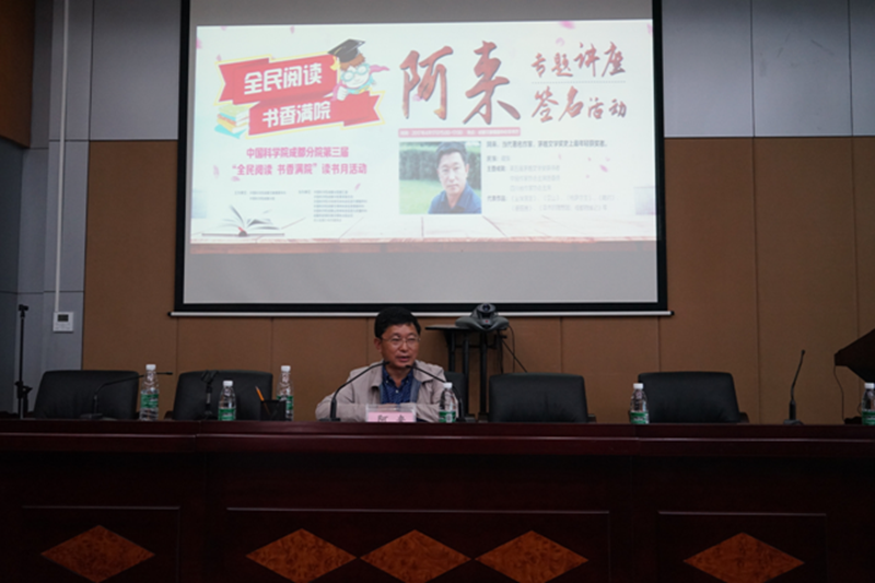 4月17日下午,当代著名作家、茅盾文学奖史上最年轻获奖者、四川省作协主席阿来应邀做客第三届成都分院“全民阅读,书香满院”读书月活动讲堂,在成都文献情报中心学术厅作专题讲座。成都文献情报中心主任张志强、中心副主任杨志萍、中科院成都分院综合办主任江晓波、四川省青少年作协主席王永忠陪同阿来参观了中心并参加了讲座,成都分院各单位职工、硕博士生、社区群众以及慕名而来的读者朋友约100多人聆听了讲座。成都分院分党组书记、常务副院长王学定专程与阿来、王永忠进行了专门交流。