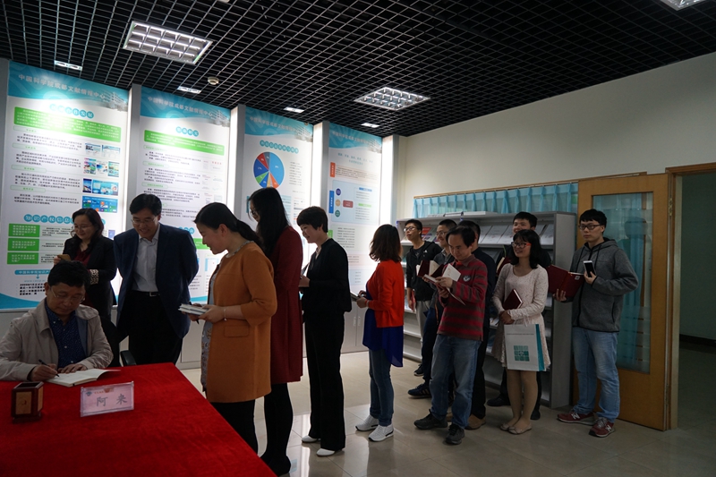 现场听众们踊跃提问,结合自己对讲座内容的理解与阿来互动交流,讲座在读者朋友们热烈的掌声中圆满落幕。最后,阿来为现场众多书迷们进行了签名拍照留念。此次讲座的成功举办为成都分院科研人员、硕博士生提供了与作家对话的平台,有益于激发听众们多读书、读好书的意识,帮助培养人们良好的阅读习惯和态度,营造良好的阅读氛围和书香气息,进一步丰富成都分院科学文化建设体系。