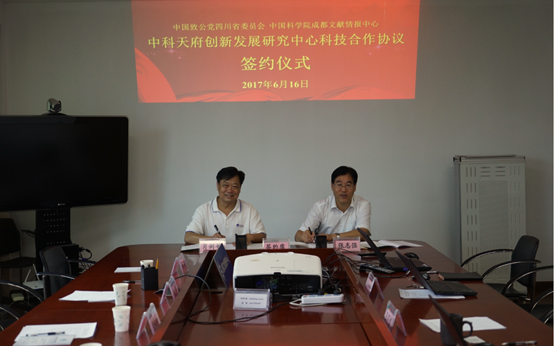 2017年6月16日,中科院成都文献情报中心与致公党四川省委员会在中科院成都文献情报中心召开共建新型智库“中科天府创新发展研究中心”合作座谈会和协议签约仪式。致公党四川省委员会专职副主委肖剑书及副秘书长张红梅与研究室、宣传处、组织处等部门负责人一行六人,成都文献情报中心主任张志强及副主任杨志萍与科技处、学科咨询服务部、区域发展咨询部等部门负责人参加座谈会与签字仪式。张志强主持座谈会。