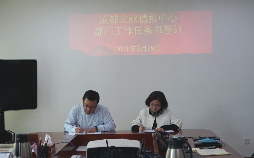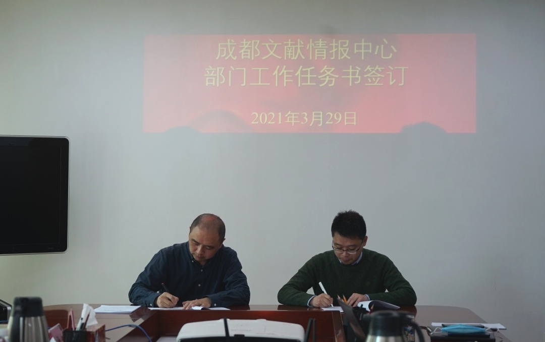 3月29日上午,成都文献情报中心召开工作例会,推动落实2021年度工作计划,并与各部门签订2021年部门工作任务书?;嵋橛芍行闹魅巍⒌澄笔榧堑擞轮鞒?。