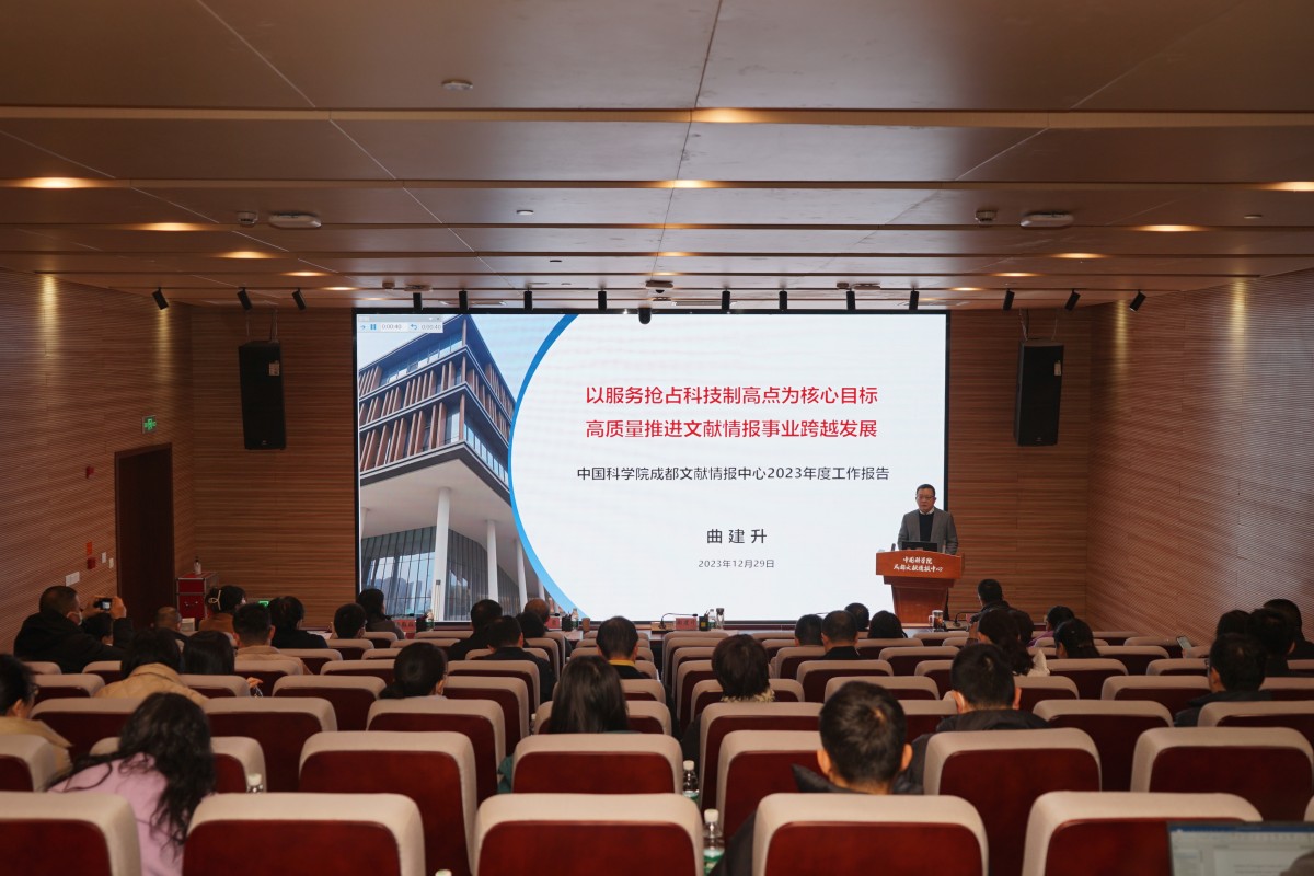 1229日,成都文献情报中心召开全体职工大会学习传达中国科学院2024年度工作会议精神,并作2023年度工作总结。党委书记曲建升,中心主任、党委副书记邓勇,副主任房俊民,纪委书记江晓波,以及全体职工100余人参加会议,成都分院分党组年终考核组到会指导。