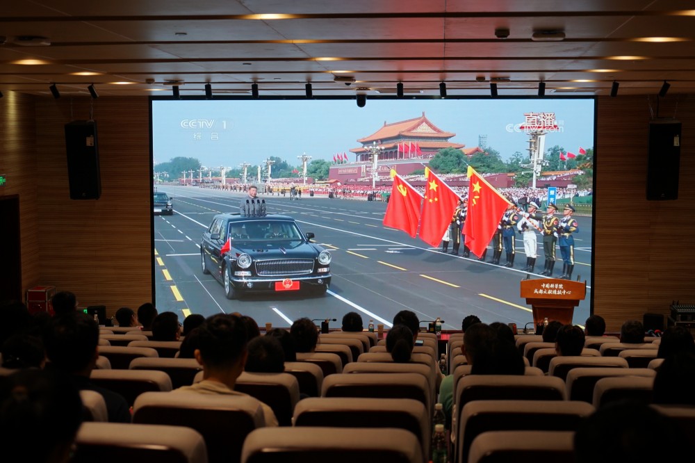 学术厅里,气氛庄重热烈,早上9点,纪念大会正式开始,全体职工认真聆听习近平总书记的重要讲话,仔细观看盛大的阅兵式,对伟大祖国取得的辉煌成就感到无比自豪、无比自信。战旗猎猎,步履铿锵,仪仗队员英姿飒爽;气势如虹,排山倒海,空中护旗梯队、徒步方队、战旗方队、装备方队、空中梯队依次通过天安门广场,充分展示了我国国防和军队现代化建设的辉煌成就。
