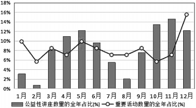 在行为上,智库凸显积极性与开放性。2015年我国智库举办的公益性讲座是2014年的2倍以上。讲座有国际化趋势,约16%的演讲者来自国外。讲座以每年5月、11月为高峰期,2月、8月为低谷期。2015年1月和12月是国内智库重大活动最多的月份,这一特征与《关于加强中国特色新型智库建设的意见》印发、首批国家高端智库建设试点单位公布两个重要事件的时间点基本吻合。(图表见文末)