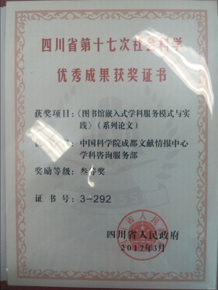 成都文献情报中心学科咨询服务部荣获四川省第十七次社会科学优秀成果奖