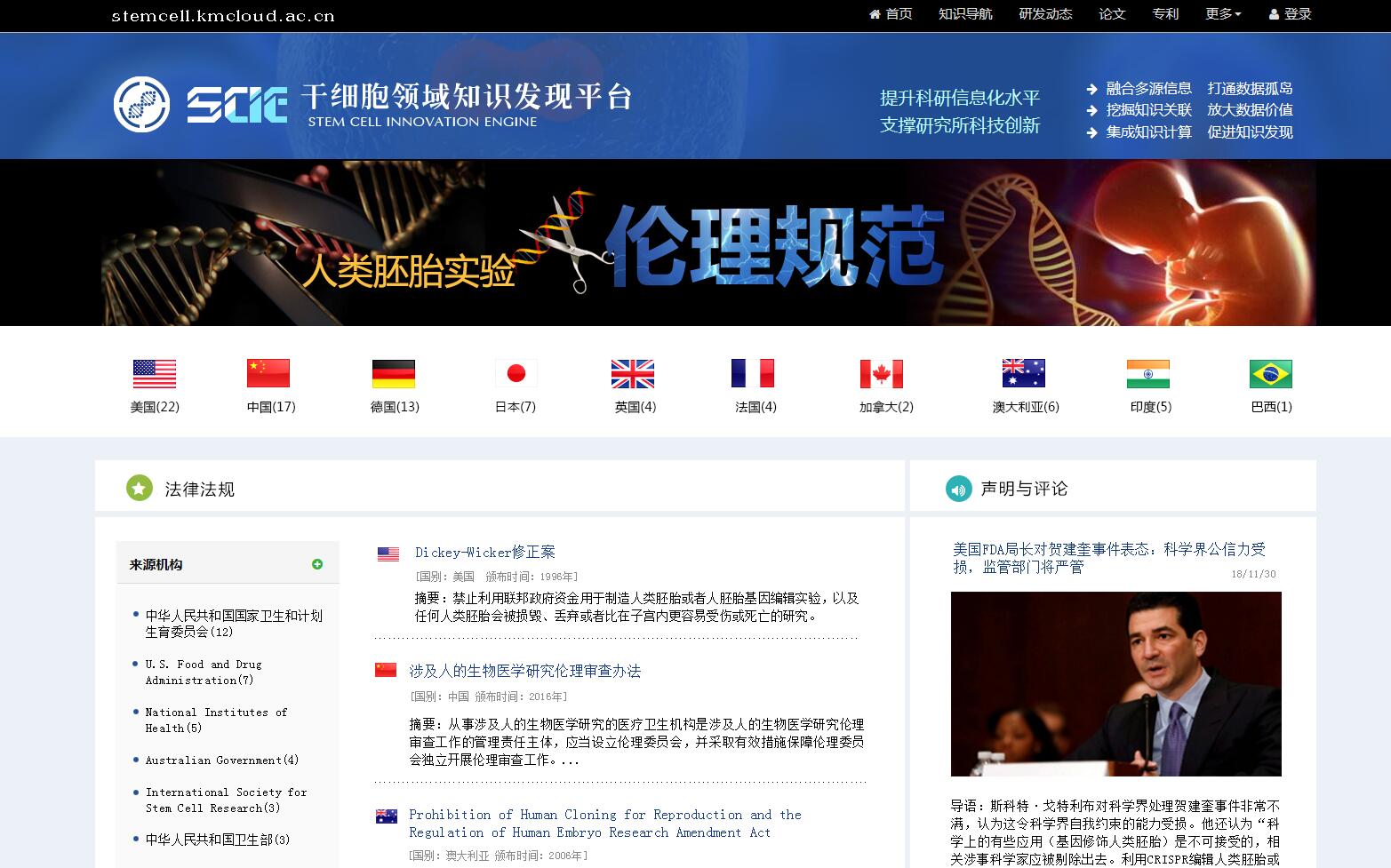 在此背景下,成都文献情报中心与广州生物医药与健康研究院系统收集全球主要国家和相关核心科学组织关于人类胚胎实验及基因编辑的法律法规与伦理规范,研建了“人类胚胎实验伦理规范数据库”。目前,该数据库收录了中国、美国、欧盟、日本、德国、英国、法国、加拿大、澳大利亚、印度、巴西等39个国家政府颁布的相关法律法规全文及中国医学科学院、美国国家科学院、美国国立卫生研究院、美国再生医学联盟等学术共同体发布的科研伦理规范声明与评论报告。数据库提供按关键词、国别、机构、发布时间检索及统计分析功能。
