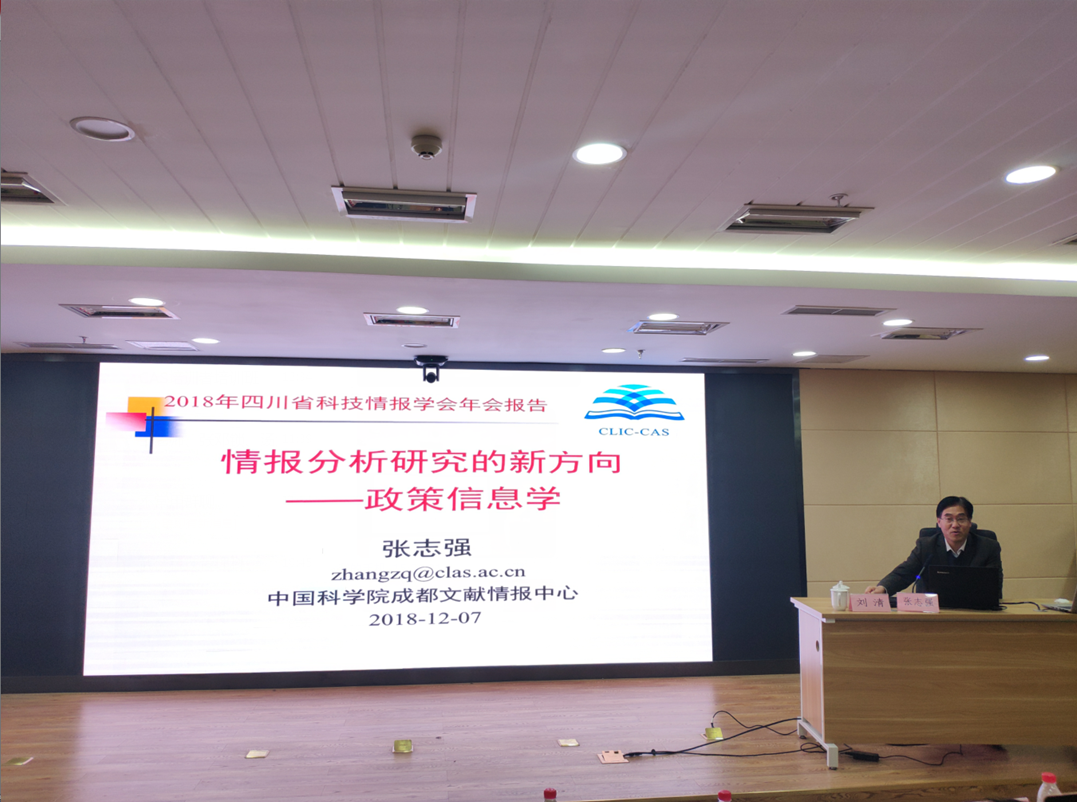 12月7日,中科院成都文献情报中心主任张志强研究员应邀在四川省科技情报学会2018年会上作题为《情报分析研究的新方向——政策信息学》的主题学术报告。学术报告由四川省信息研究所副所长刘清主持,参加四川省情报学会2018年会的80多位与会代表听取学术报告。