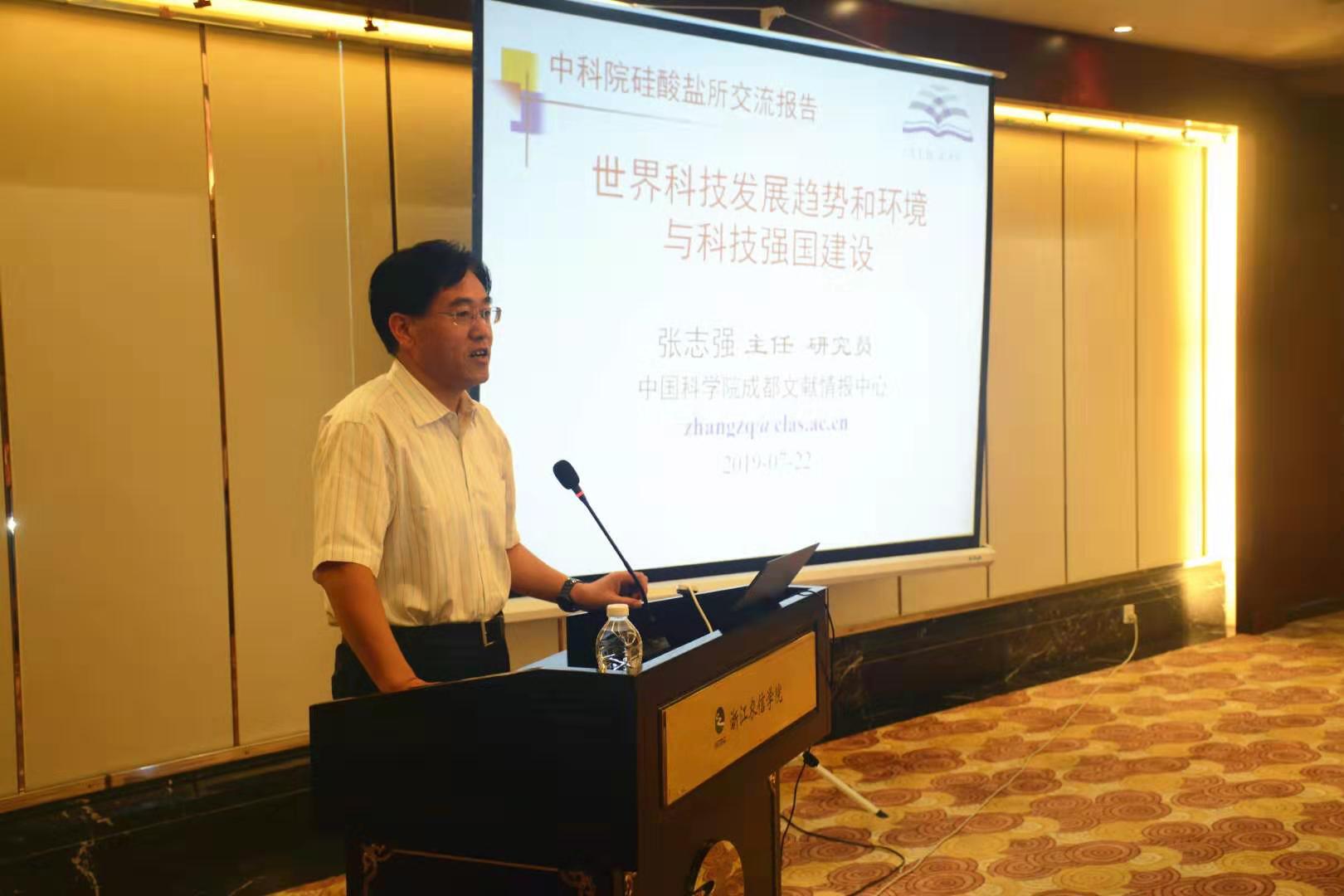 7月22日,中国科学院成都文献情报中心主任张志强研究员应邀为中国科学院上海硅酸盐研究所2019年度领导干部和科研骨干培训班暨“不忘初心、牢记使命”主题教育专题学习研讨班作题为《世界科技发展态势和环境与科技强国建设》的专题报告。中国科学院上海硅酸盐所全体所领导、中层干部、课题组长等70多人参加。报告会由中科院上海硅酸盐研究所所长宋力昕主持。