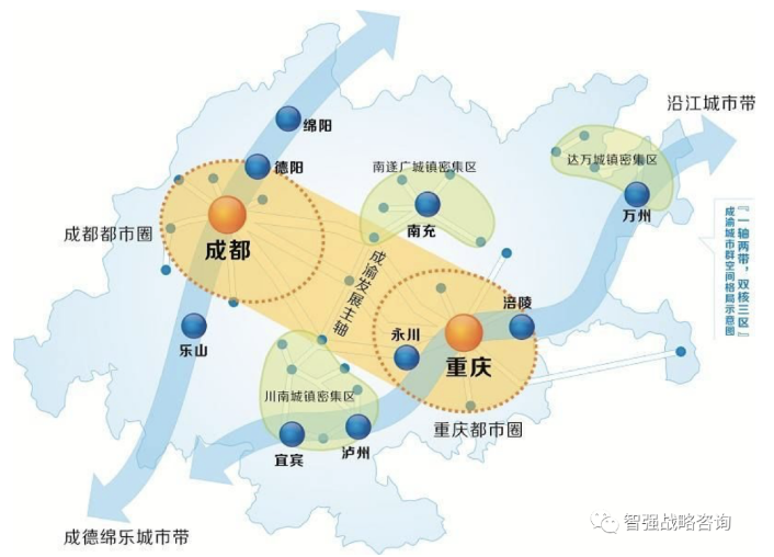 图1 成渝经济圈成渝主轴两翼的战略性二级节点支撑城市
