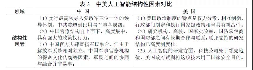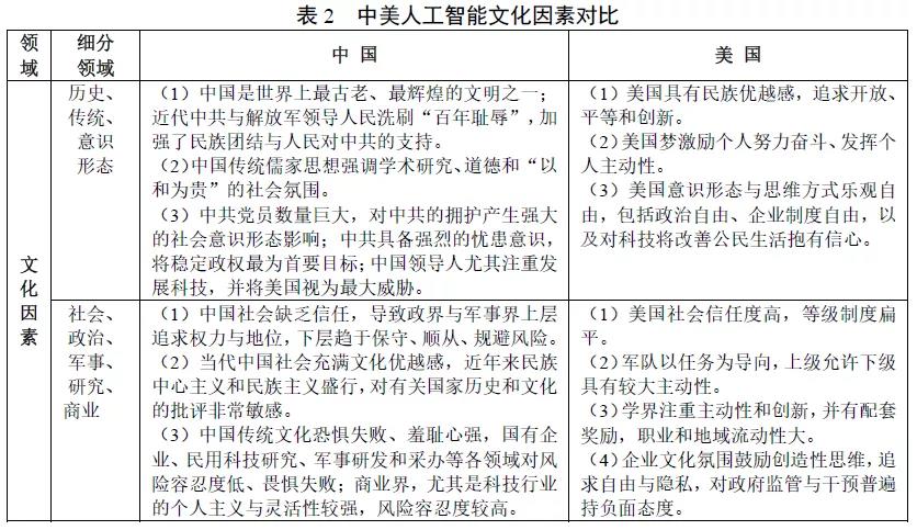 在政治、军事、经济和科学领域,文化和结构都会影响社会和组织的进程和结果。就国家人工智能战略的成功实施可能性而言,文化因素更利于美国取得胜利(表2)。