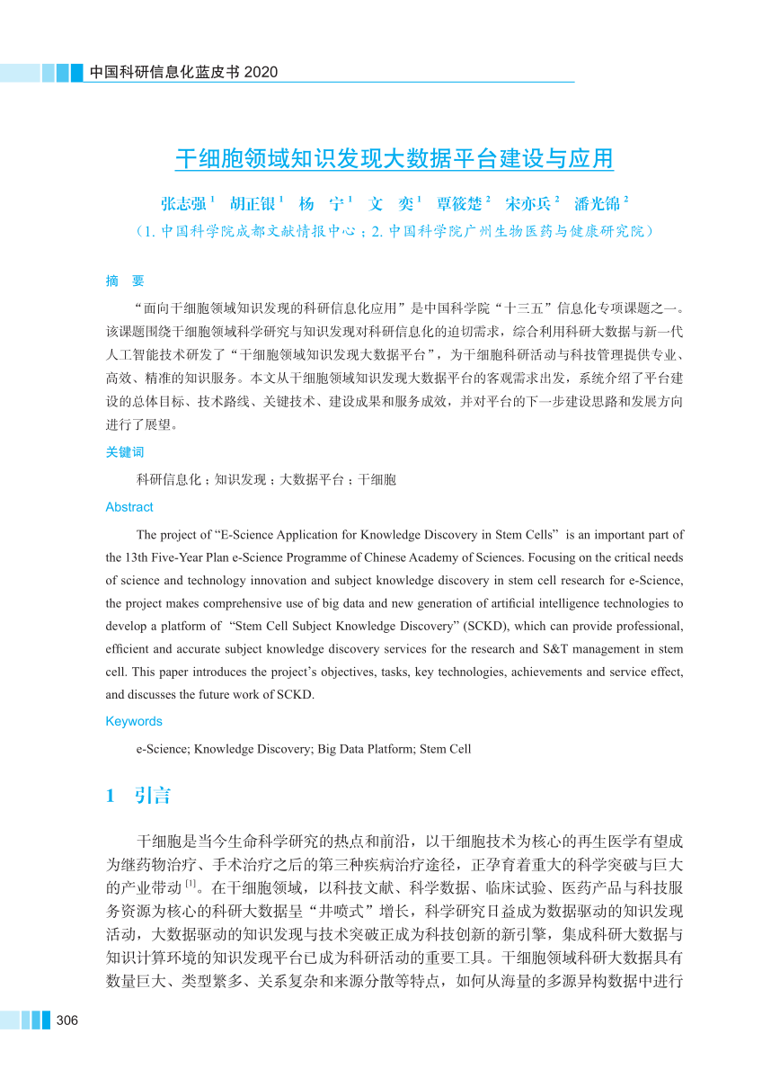 “面向干细胞领域知识发现的科研信息化应用”是中国科学院“十三五”信息化专项任务之一,其核心产出“干细胞知识发现平台”被评为2019年度中国科学院信息化优秀案例。项目团队撰写的《干细胞领域知识发现大数据平台建设与应用》一文(作者:张志强、胡正银、杨宁等)入选《蓝皮书2020》第三篇:面向国民经济主战场。文章从干细胞领域知识发现大数据平台的客观需求出发,系统介绍了平台建设的总体目标、技术路线、关键技术、建设成果和服务成效,并对平台的下一步建设思路和发展方向进行了展望。