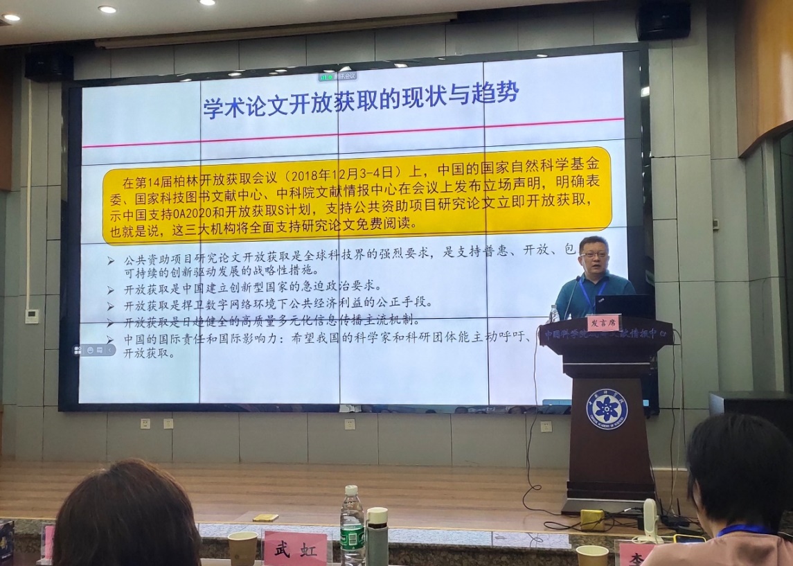 成都文献情报中心党委书记曲建升研究员致辞并做了题为“开放科学环境下的开放科学组织模式”的主旨报告。曲建升指出,开放科学领域近几年处于快速发展阶段,中科院一直在积极推动国内开放资源建设的发展,希望此次会议能够积极推动国内全面开放知识环境建设事业。在主旨报告环节,曲建升总结了开放获取在国内的发展历程、中科院机构知识库建设进展和开放出版取得的成果,提出积极推动开放获取、开放科学理念,构建新型高端学术交流平台。