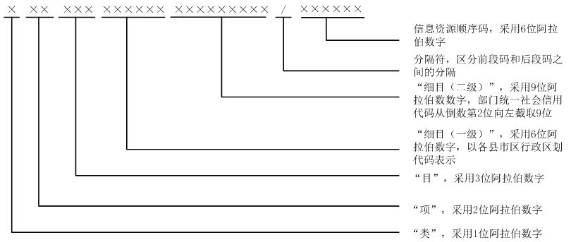 政务数据资源唯一不变的标识代码,参照GB/T 21063.4-2007《政务信息资源目录体系第4部分:政务信息资源分类》的代码结构规则,政务数据资源代码结构由类、项、目、细目、顺序码组成。