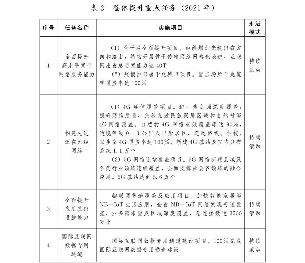 建成高水平宽带网络,全面提升骨干网承载能力和互联网省际出口带宽,规?;渴鹎д壮鞘校氐愠∷д卓泶哺锹蚀?00%。进一步加强4G深度覆盖,提升网络质量。实现5G网络连续覆盖,全面支撑社会各领域的融合应用。全面提升应用基础设施能力,完成国际通信枢纽及国际互联网数据专用通道建设。(详见表3)