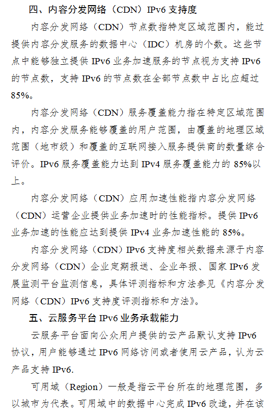 (二)加快提升内容分发网络(CDN)IPv6应用加速能力。阿里云、腾讯云、网宿科技、蓝汛、金山云、百度云、华为云、京东云、帝联科技、UCloud、白山云、七牛云、鹏博士、中国移动加快内容分发网络IPv6深度改造,提升IPv6服务资源占比、扩大IPv6服务覆盖范围、优化IPv6应用加速性能。到2020年末,内容分发网络支持IPv6的节点数达到IPv4节点数的85%以上;按地市级行政区划,IPv6服务覆盖能力达到IPv4服务覆盖能力的85%以上;IPv6应用加速性能达到IPv4应用加速性能的85%以上。