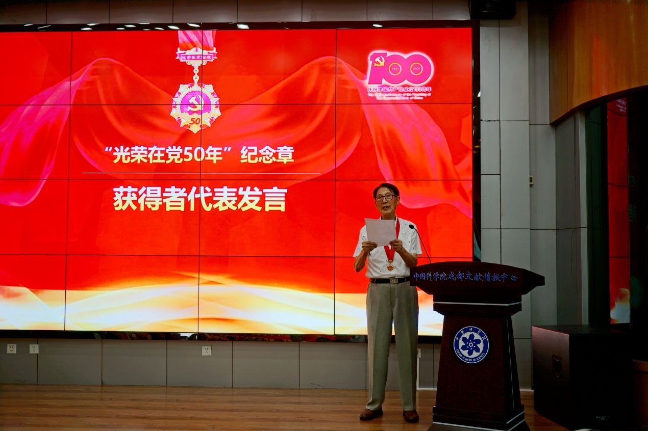 阚瑞亭和余清泰两位老党员在会上发言。因身体原因不能亲临会场的阚老通过视频向中心全体党员送上了祝福;余老深情回顾了自身参加革命的峥嵘岁月,讲述了自己在中心工作的经历,对中心未来的发展寄予厚望,并对年轻一代给予了殷殷嘱托。