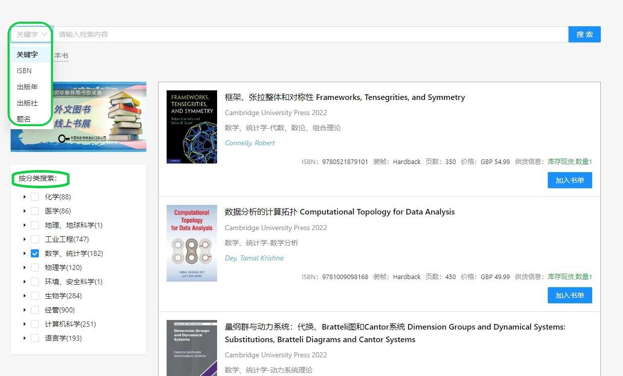 2.登录后,点击选择搜索浏览方式,可按照关键词、ISBN、出版社、出版年,学科类别等进行检索,(点击书名,可查看详细信息)