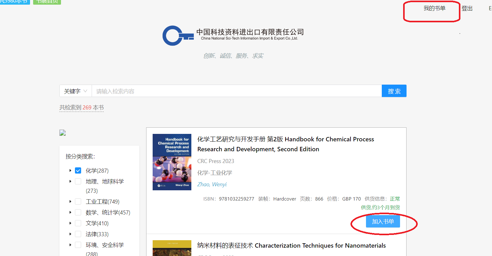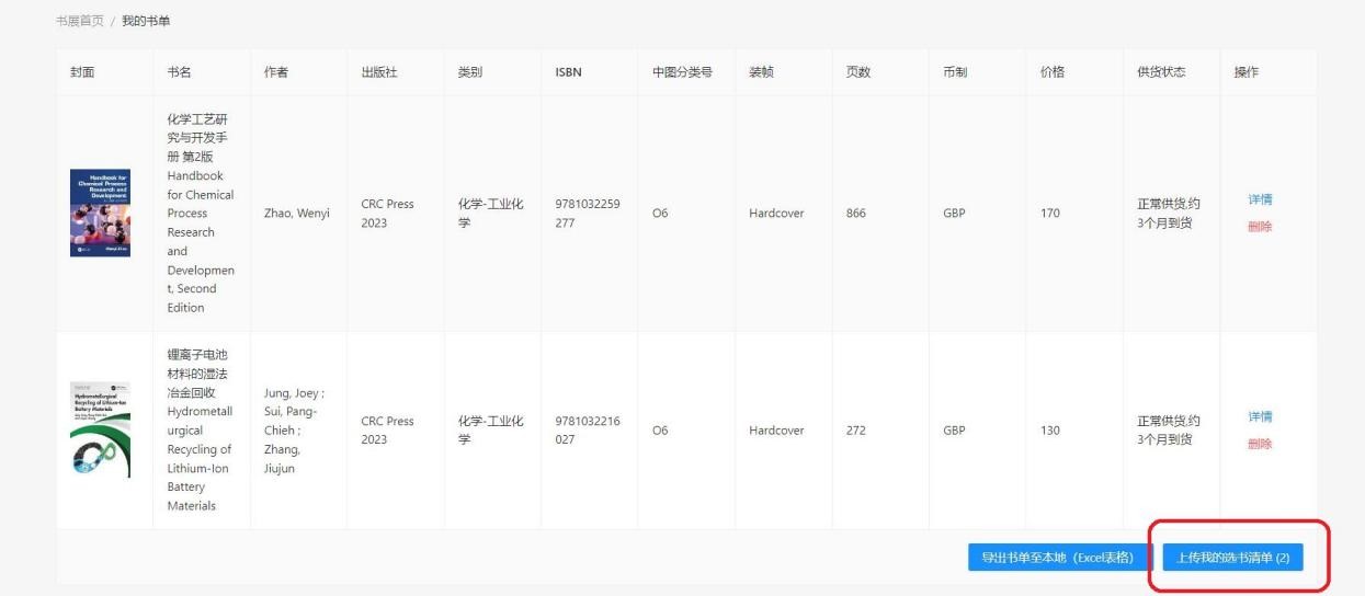 3点击“加入书单”后,可在“我的书单”中导出,删除,上传已选图书。
