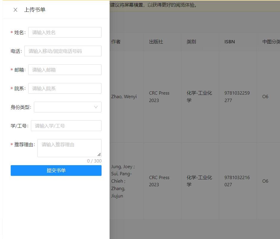 5.填写姓名、电话、邮箱、院系、学/工号(即研究领域)等信息后,点击“提交书单”上传即可。
