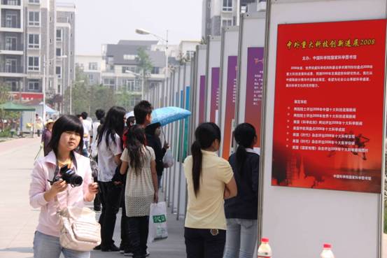 4月16日,作为科学文化传播重要形式之一的科学知识巡展——《中外重大科技成果2008》进入阿坝师范高等专科学校举办,为该校师生送去最新的科普知识。展览活动由成都分馆与阿坝师专图书馆联合举办?;疃聪煲斐G苛遥莶煌耆臣?,当天观看展览就达3000多人次,并在布展尚未结束就已有不少同学聚集到展板前,认真观看展览图片。不少老师、同学主动给我们提出建议,希望这次巡展能多展览今天;还希望能看到一些有关社会科学知识的展览内容;并希望此类活动能长期坚持下去。阿坝师专学生记者对这次活动做了专访,并在校园网进行了专题报道。