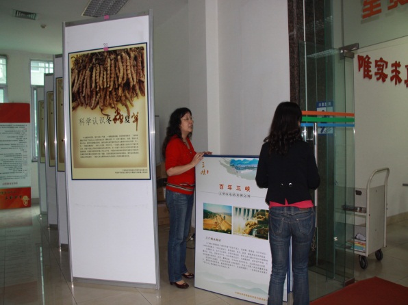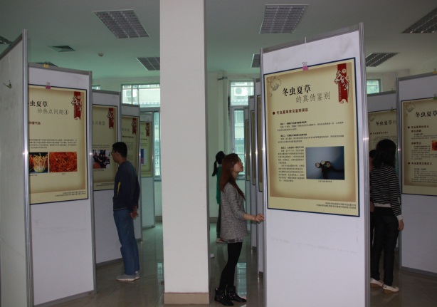 在布展期间,便有不少来往的读者被吸引而驻足观看。截止下午信息服务部的工作人员离开前,已有前来分馆查询资料和查阅书刊的读者、分馆工作人员、分院研究生以及前来参加短期培训的海洋所、植物所等单位的工作人员数十人前来观看,普遍反映展览做工精美,内容丰富专业,看后获益良多,消除了他们以往对市面上盛传的一些关于冬虫夏草的误解?;褂胁喂壅哂哪乜嫘λ?,图片很精美,栩栩如生,真想把冬虫夏草从展板里取出来,然后带回家做养生食材。