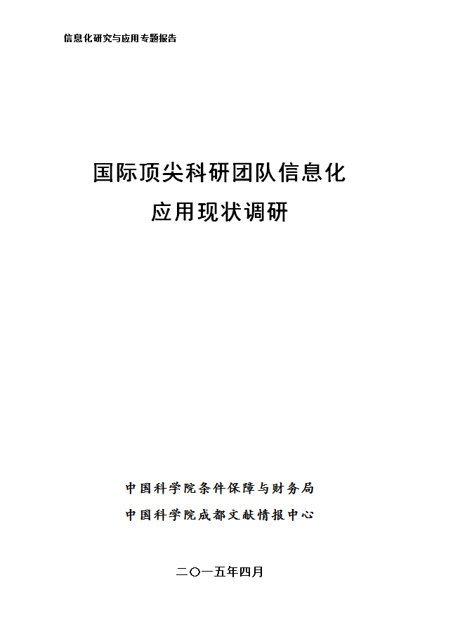 “国际顶尖科研团队信息化应用现状调研”专题报告重点调研了国际上具有重大产出的十个顶级科研团队,从团队研究方向、重大成果、组织结构及其所利用的信息化工具/资源/大型科研设施等多方面展开调查与总结。这些科研团队的研究领域涉及生物学、医学、网络安全、物理学等,团队具体包括:完成人类基因组部分染色体解码分析工作的美国能源部联合基因研究所、引领医学研究/临床实验及教学的美国斯坦福大学医学院、揭示人类语言障碍等疾病原因的德国马普人类认知与脑科学研究所、验证地月数据传输的美国林肯实验室、位居2014年全球高校学术排名物理系第1位的美国加州大学伯克利分校物理系、探测到希格斯粒子的欧洲核子研究中心、创造出锗锡半导体激光器的瑞士保罗谢尔研究所以及产生29位诺贝尔获奖者的英国剑桥卡文迪许实验室等。